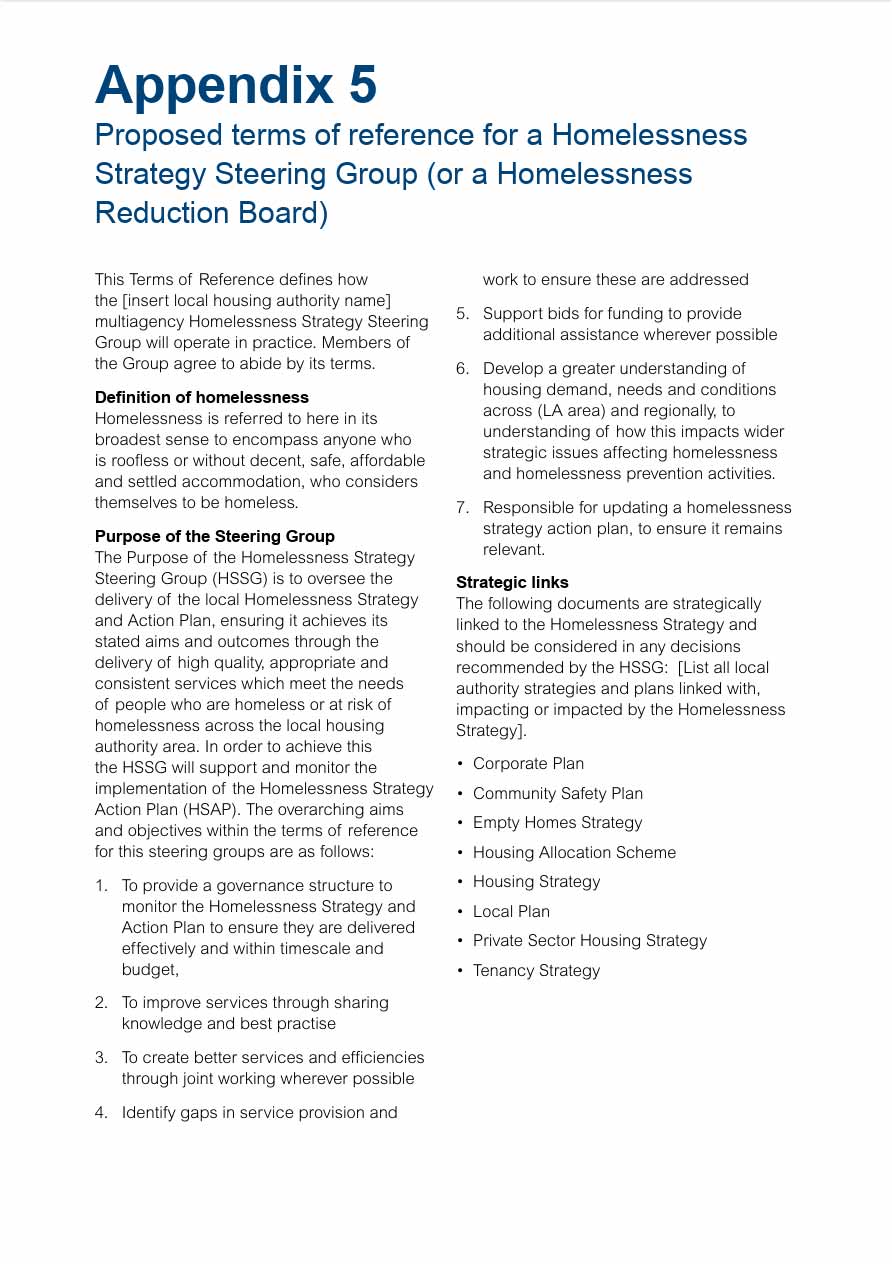 Local housing authorities are required to oversee homelessness strategies, which should involve collaboration with social services, private housing providers, and other relevant organisations. These strategies aim to provide stronger protection for vulnerable individuals, improve services for the homeless, and address the root causes of homelessness. While there is no legal requirement for specific forums to coordinate homelessness activities, many areas already have successful forums, and the establishment of a Homelessness Reduction Board can further enhance collaboration.