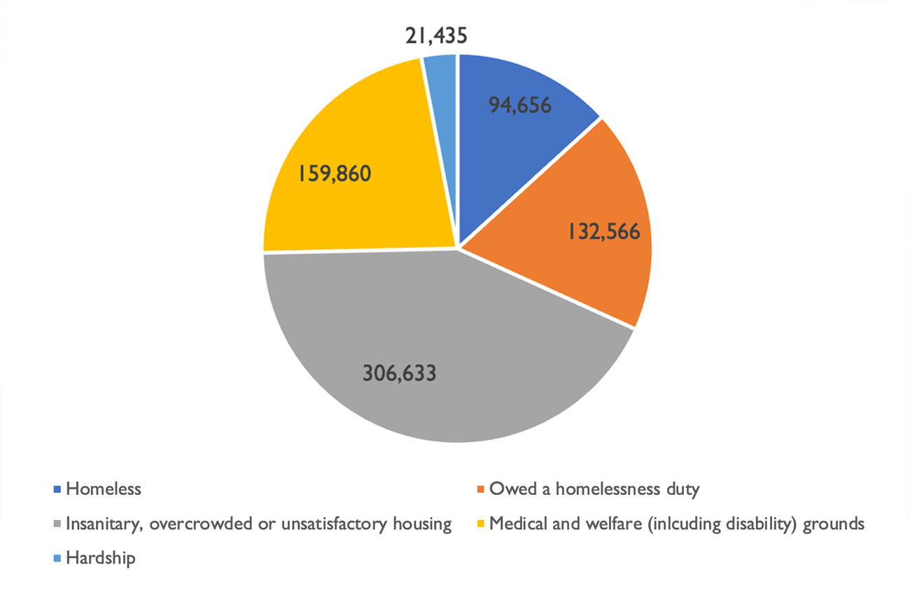 Nearly half of all households with a reasonable preference were due to living in unsanitary, overcrowded, or unsatisfactory housing conditions, about twice as many as those owed a homelessness duty or needing to move for medical or welfare reasons, about three and a half times as many as those homeless, and about 15 times as many as those needing to move due to hardship.