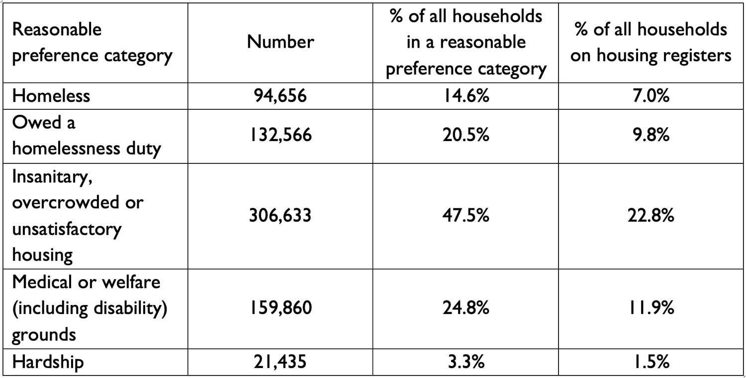 Table: number and percentage of households on housing registers by reasonable preference category, compared to percentage of all households on housing registers.